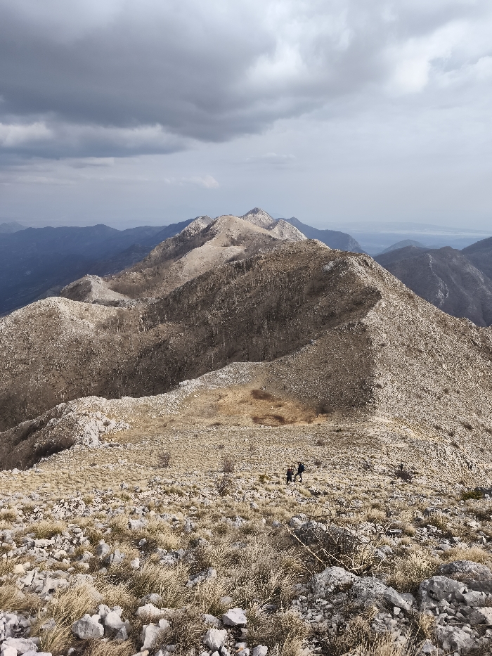 The scene depicts a high-altitude mountainous environment in the city of Mali Mikulići, Montenegro. The foreground and mid-ground consist of rugged, rocky terrain sparsely covered with dry, light-brown grass and scattered leafless shrubbery. Two individuals, appearing as hikers, are observed in the mid-ground, traversing a rocky slope from left to right. The person on the left, slightly larger, wears dark clothing and carries a dark backpack. The person on the right, smaller in stature, also wears dark clothing and carries a dark backpack. Further back, a series of barren mountain ridges with similar rocky composition extends towards the horizon. The distant mountains exhibit a blueish haze, indicative of atmospheric perspective. A body of water, likely a sea or large bay, is faintly visible on the far right horizon. The sky is predominantly overcast with dense, dark grey clouds overhead, transitioning to a lighter grey-blue near the horizon, suggesting diffused lighting conditions.