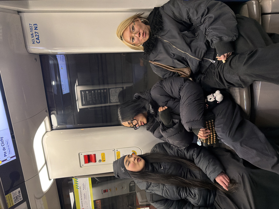 Inside a train car, three young women occupy a row of seats. The woman on the top is fair-skinned with blonde hair and wears a black bomber jacket. In the middle, a woman with dark hair and glasses is dressed in a puffy black coat. At the bottom, a woman with long dark hair and a black beanie completes the trio. The train car interior includes emergency release levers, a digital route map, and closure notices, with train route identifiers such as "N3.VA-1027" and "CA27 N3." The "Pte de Clichy" station is displayed on a digital screen.