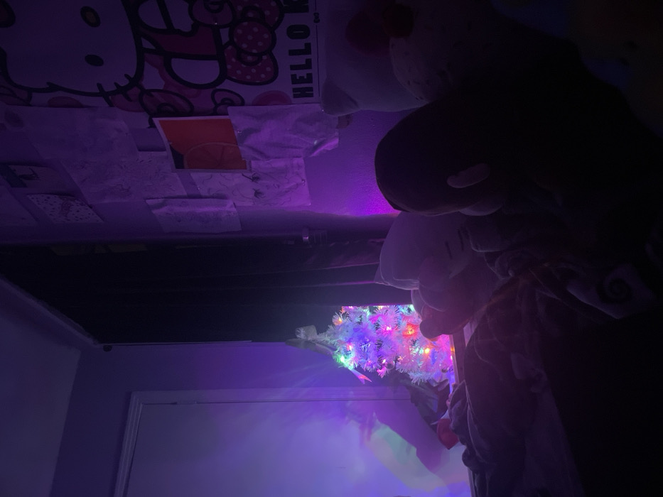 A room is illuminated with purple light, possibly from LED strips. A "Hello Kitty" poster and several smaller papers adorn the ceiling. Stuffed animals occupy the upper right corner. Below the posters, a dark, flat surface spans horizontally. A white Christmas tree with colorful lights sits near a door and wall in the lower left. The overall ambiance is dark and whimsical.