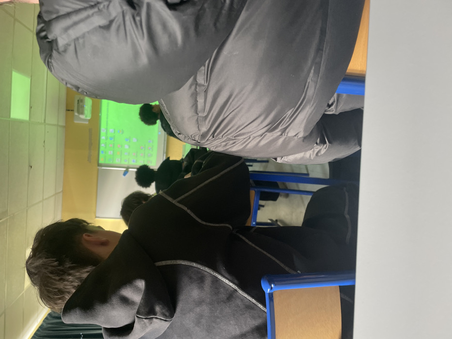 The scene depicts the interior of a classroom in Hérouville-Saint-Clair, France, viewed from a seated position. In the immediate foreground, a light grey table surface is present. To the left, the back of a person is visible, wearing a dark grey or black hooded sweatshirt with distinctive light grey double-stitched seams that form a V-shape across the upper back and extend along the sleeves. This individual has dark brown, medium-length hair and is seated in a chair with a light brown wooden backrest and a blue metal frame. To the right, the partial back and shoulder of another seated individual wearing a dark grey or black puffer jacket are visible. Further into the room, several other individuals are seated at desks, facing the front. Their backs and heads are visible, with at least two individuals exhibiting dark, possibly curly, hair. The front of the classroom features a large white surface serving as a projection screen. It displays a bright green computer desktop background populated with numerous application icons. A white overhead projector is mounted on the white ceiling, projecting onto this screen. The wall above the projection screen is painted yellow. Rectangular fluorescent light panels are integrated into the white ceiling, with some casting a greenish tint, likely from the projector's light spill. A dark fabric or wall section is visible on the far left of the frame. All visible individuals are seated and oriented towards the front of the classroom, indicating their attendance at a lesson or presentation.