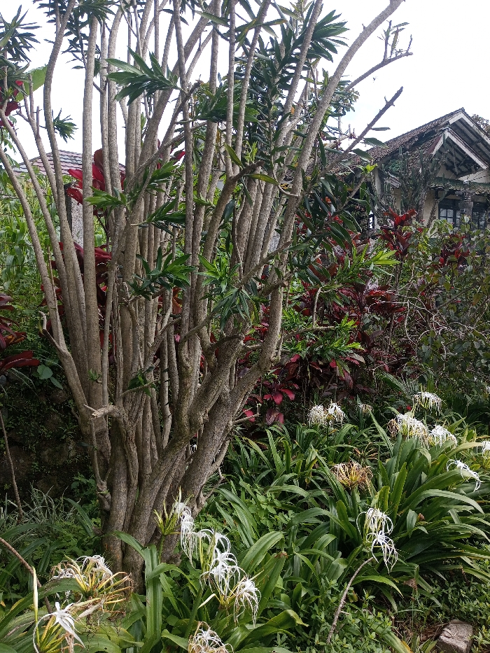 A dense cluster of slender, bare-trunked trees occupies the foreground, interspersed with some green leaves. Below, a mass of leafy green plants with delicate white spider lilies blooms. Further back, a riot of red-leaved plants adds color. An old house with a weathered roof and dormer windows stands partially obscured in the background. Lush greenery surrounds the scene.