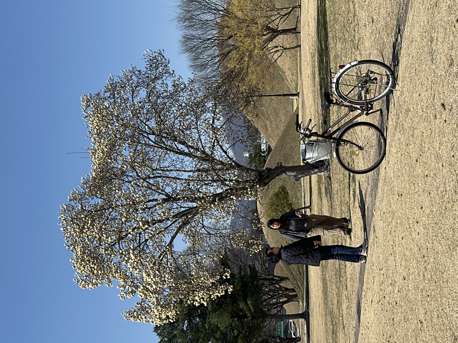 An outdoor scene is depicted within Daereungwon Tumuli Park in Gyeongju-si, South Korea. The ground consists of dry, light brown grass with a visible dirt path in the foreground. A dark-framed bicycle with a silver-colored frame, front white wire basket, and rear rack is parked upright on a kickstand in the right foreground. Two adult females are present in the mid-ground. The individual on the left stands facing right, wearing a dark quilted jacket, blue jeans, and light athletic shoes. The individual to her right walks left, wearing a dark hooded sweatshirt, light brown pants, and dark shoes. Behind them, a large deciduous tree, possibly a magnolia, stands in full bloom with numerous white flowers. Several large, grass-covered burial mounds (tumuli) are prominently visible in the background, along with various other trees (some bare, some evergreen, one with yellow blossoms) and a distant mountain range. The sky is clear and blue, indicating sunny conditions.