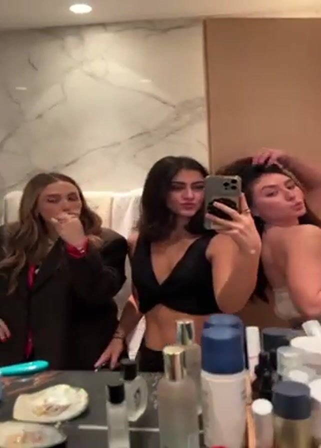 Three women are in a bathroom in front of a mirror, preparing for something. The woman on the left is brushing her teeth. She has long brown hair and is wearing a dark blazer with a red shirt underneath. The woman in the center is taking a selfie video of the group while also brushing her teeth. She is wearing a black top that exposes her midriff and has short dark hair. The woman on the right is applying lipstick or lip gloss while posing. She has long dark hair and is wearing a light-colored strapless dress. The bathroom has marble walls and countertops covered with toiletries. There is music playing in the background.