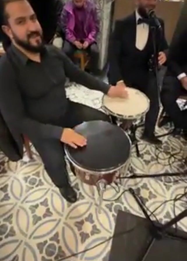 group of six men performing music in what looks like a restaurant. All are dressed in formal wear, either a black shirt or a tuxedo. The man in the front left plays a drum set, specifically two bongo-like drums, while seated. Two other men beside him sing into microphones. All musicians seem to be seated in chairs. The restaurant setting is visible in the background, with people seated at tables. The floor has a patterned tile design. The overall impression is a live music performance within a restaurant setting.