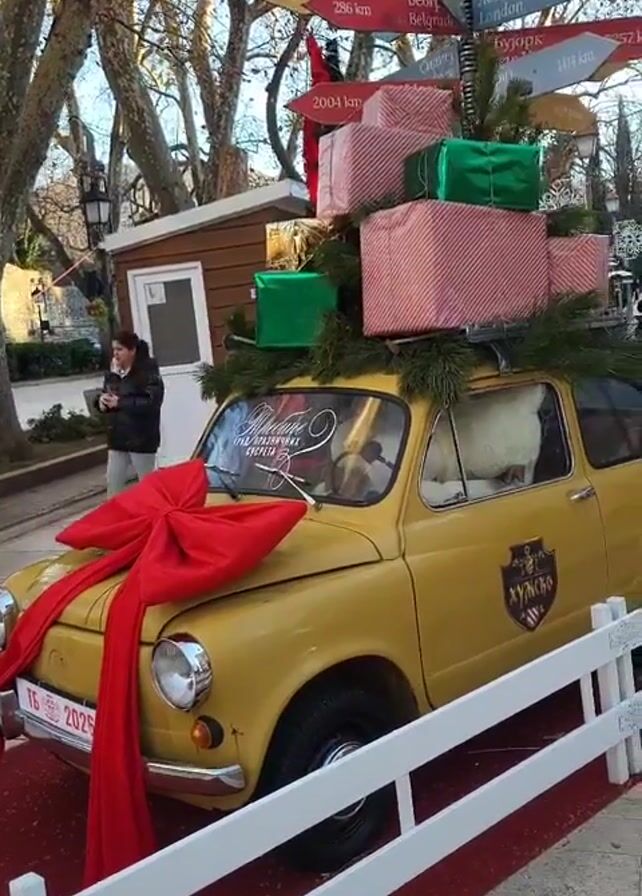 The video captures a charming Christmas-themed display outdoors. The focal point is a small, yellow car, decorated with a large red bow on the front and a stack of Christmas-wrapped presents on the roof. The car is positioned on a red carpet, surrounded by a small white fence. In the background, a woman is standing near a small, wooden structure. A tall lamppost displaying directional signs to various cities is seen behind the car. The environment consists of bare trees and a clear sky, suggesting a winter setting.