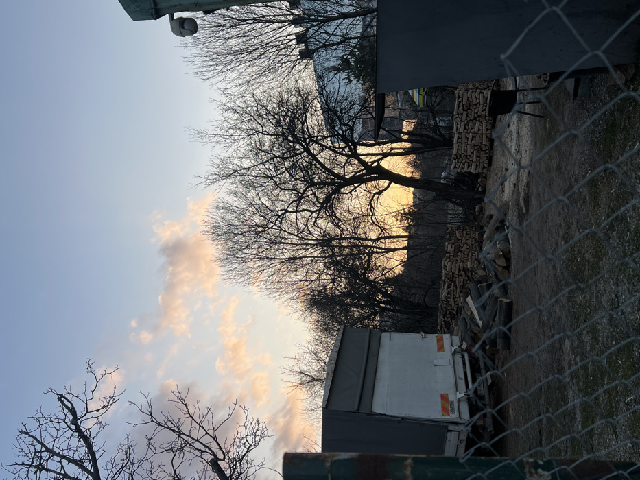 The scene captures an outdoor area at either dawn or dusk within Sofia, Bulgaria, characterized by a low sun casting an intense orange-yellow glow on the horizon. A blurred chain-link fence occupies the immediate foreground. To the left, a dark green metal fence post is partially visible. In the midground, a white truck with a dark grey canvas-covered cargo area is parked, displaying its rear with taillights and a partially legible Bulgarian license plate. Adjacent to the truck, substantial piles of neatly stacked firewood logs are present on the unpaved ground, along with additional scattered logs. To the right, a dark chair is visible near more stacked firewood. A dark rectangular structure, possibly part of a building, stands on the far right, with a white dome-shaped surveillance camera mounted on an upper dark green fixture. The background features a dense concentration of silhouetted, bare deciduous trees. A reflective building facade is discernible behind the trees on the right. No human subjects or active interactions are visible.