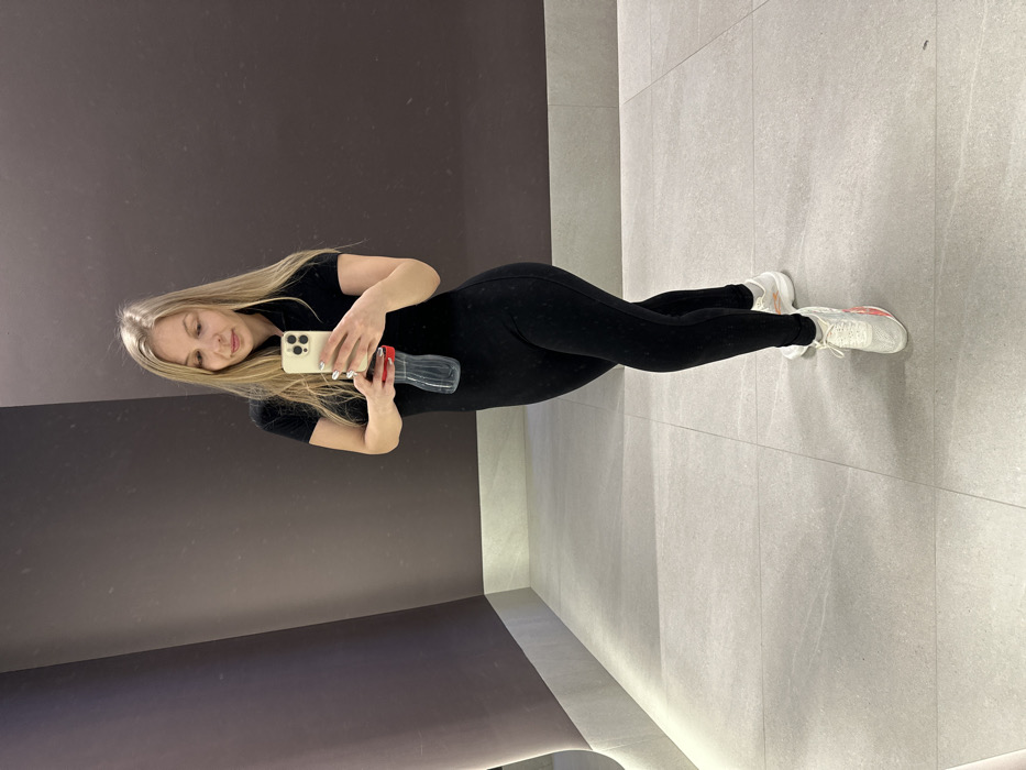 A young woman with long, blonde hair takes a selfie in a mirror. She is dressed in a tight, black bodysuit and white sneakers. She holds a phone in her right hand and a clear plastic bottle, possibly filled with water, in her left. The background consists of a dark, glossy wall and a light gray tiled floor. The photo is well-lit and the subject appears to be in a public restroom or dressing area.