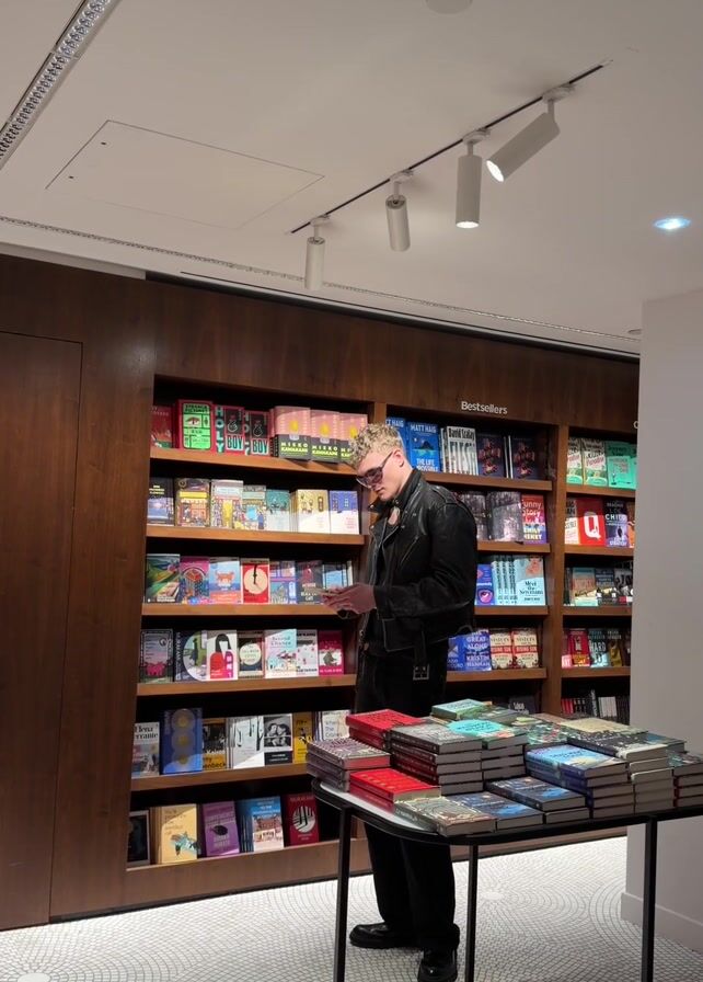 A man is in a bookstore, wearing a black leather jacket, black pants, and sunglasses. He is standing in front of a bookshelf filled with books and a table stacked with more books. He picks up a book from the shelf, examines it, and puts it back. He then gestures with his hands, appearing to be in thought. The bookstore has a modern design with bright lighting, dark wood shelves, and a patterned floor. The bookshelf is labeled "Bestsellers".