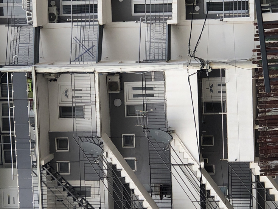 This image captures a multi-story residential building facade in Čanj, Montenegro. The structure features at least five visible levels, characterized by alternating sections of white and medium-gray exterior walls. A prominent external staircase with white treads and dark gray metal railings ascends the left side of the building, providing access to multiple floors. Each floor features balconies with dark gray metal railings; some railings display a simple vertical bar design, while others incorporate decorative patterns. Numerous white doors, some double-leaf and others single with an arched transom window, serve as entrances to individual units, often opening onto balconies. Dark-framed windows are also distributed across the facade. Specific objects include two dark gray satellite dishes mounted on the gray wall sections, one on the second visible floor from the bottom and another on the third. Multiple light-colored outdoor air conditioning units are affixed to the exterior walls. A blue, foldable clothes drying rack stands on a white balcony on the right side of the image, and a smaller, silver drying rack is clipped to a railing on a third-level balcony on the left. A small, round, dark table with a pedestal base is visible on a lower-left balcony. A green chair is partially visible on the uppermost balcony on the left. A white utility pole or conduit runs vertically along the right side of the central building section, with black electrical wires fanning out and connecting to the structure. A circular white light fixture is mounted on a gray wall section. The numeral "8" is visible above a white double-leaf door on the second floor from the bottom. The lowest portion of the image reveals the top of a weathered, dark brown wooden plank fence, partially obscured by a dark gray metal railing in the foreground. No individuals are present in the scene.