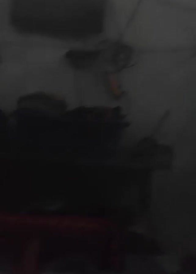 Okay, here is a detailed description of the video: The video shows a poorly lit interior space. The walls appear to be a neutral color. A flat-screen television is mounted on the wall, and beneath it is a shelf containing a dark-colored storage bin filled with what appear to be folded clothes or fabrics. A tangle of wires and a small orange device hang from the wall near the television. In the foreground, a bed with red and white bedding is partially visible. The room is dark, and lighting is dim, making details difficult to discern. The ceiling appears to be made of corrugated metal.
