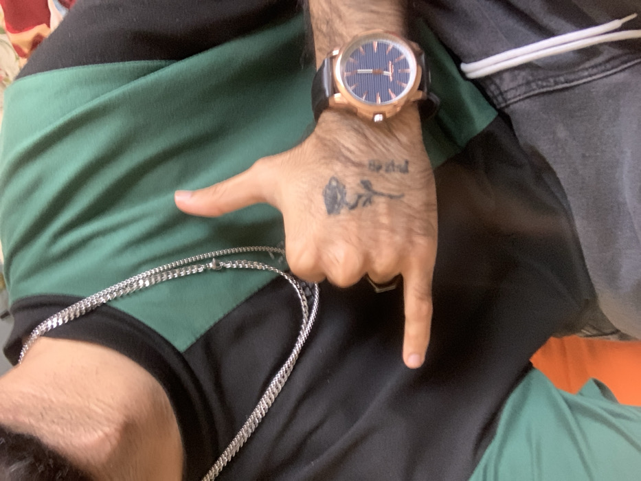 The image, captured in Goliam Izvor, Bulgaria, presents a close-up view of an individual from the upper torso to the upper thighs. The subject is wearing a two-toned short-sleeved shirt, dark green on the right side (viewer's perspective) and black on the left. Two silver-toned necklaces are visible around the neck: a thicker Cuban link chain layered over a finer, less defined chain. Dark grey or black trousers with a white drawstring on the right side are also visible. The subject's right hand is prominently featured, forming a "shaka" gesture with the thumb and pinky extended. On the back of the right hand, a black tattoo of a rose is visible near the base of the thumb, accompanied by vertically oriented, partially legible text. A wristwatch with a rose gold-colored case, a dark blue dial with horizontal texture, and a black leather strap is worn on the right wrist. A plain, dark-colored band ring is present on the ring finger of the right hand. The background is out of focus, displaying indistinct patterns and colors consistent with an indoor setting.