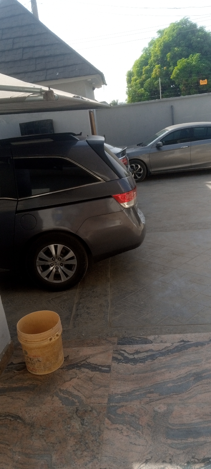The scene depicts an outdoor area in Narayi, Nigeria, under bright daylight. In the lower-left foreground, a dirty, light brown plastic bucket with a ribbed top sits on a tiled floor featuring brown, black, and grey swirling patterns. Immediately beyond, a dark grey Honda Odyssey minivan is parked, oriented away from the viewer, with its rear passenger side and wheel visible. It features a roof rack and a small rear spoiler. Further in the background, a lighter grey Honda sedan is parked, partially visible behind the minivan, on a lighter grey paved surface. To the upper left, a building structure with a dark grey sloped roof and a light-colored awning is partially visible. A light grey concrete perimeter wall with an electric security fence, including visible wires and insulators, stretches across the background. A yellow warning sign is partially visible on the fence. Above the wall and fence, lush green trees rise against a clear, light sky containing faint utility lines. No individuals are present.