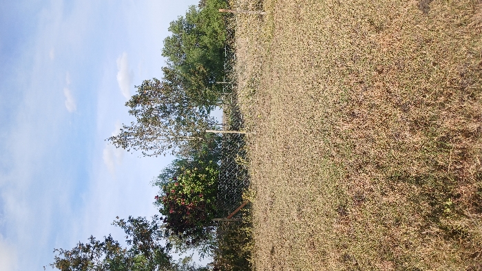 The scene depicts an outdoor landscape in Kaputiei North ward, Kenya. The foreground consists of dense, dry, light brown and greenish-brown low-lying vegetation. A wire mesh fence, supported by multiple vertical wooden posts, extends across the midground, partially obscured by surrounding plant growth. Behind the fence, a varied line of trees with green and reddish-brown foliage forms the background. The sky above is blue with scattered white cumulus clouds. No individuals, actions, or specific interactions are present in the image.