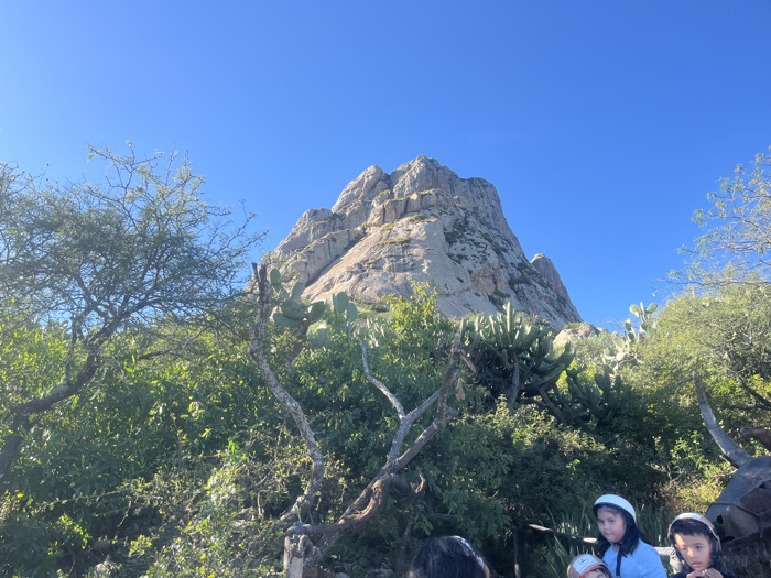 The image depicts a panoramic view of the Peña de Bernal, a prominent monolithic rock formation, in Bernal, Mexico, under a clear, bright blue sky. The Peña occupies the upper-mid and background, presenting a light-colored, rugged geological structure with visible rock faces and natural crevices. The midground and foreground are characterized by dense, arid-region vegetation. Numerous green leafy trees and shrubs, some with gnarled or weathered branches, are scattered throughout. Various cacti species are visible, including several large, multi-branched columnar cacti and smaller, paddle-shaped nopal cacti. The foliage is predominantly vibrant green, indicating a healthy ecosystem. In the lower right quadrant of the image, three young children are partially visible. One child, positioned centrally on the right, wears a light blue long-sleeved top and a white helmet, looking towards the viewer. To their immediate right, another child, wearing a similar white helmet, is partially seen, looking forward. The top of a third child's head, also wearing a light-colored helmet or hat, is visible in the bottom-left corner of the frame. The children appear to be observing the scene or are passengers in an unseen vehicle or seating arrangement, positioned below the primary line of vegetation. No specific actions or interactions are discernible between the individuals or with the environment. The overall lighting suggests a sunny daytime setting.