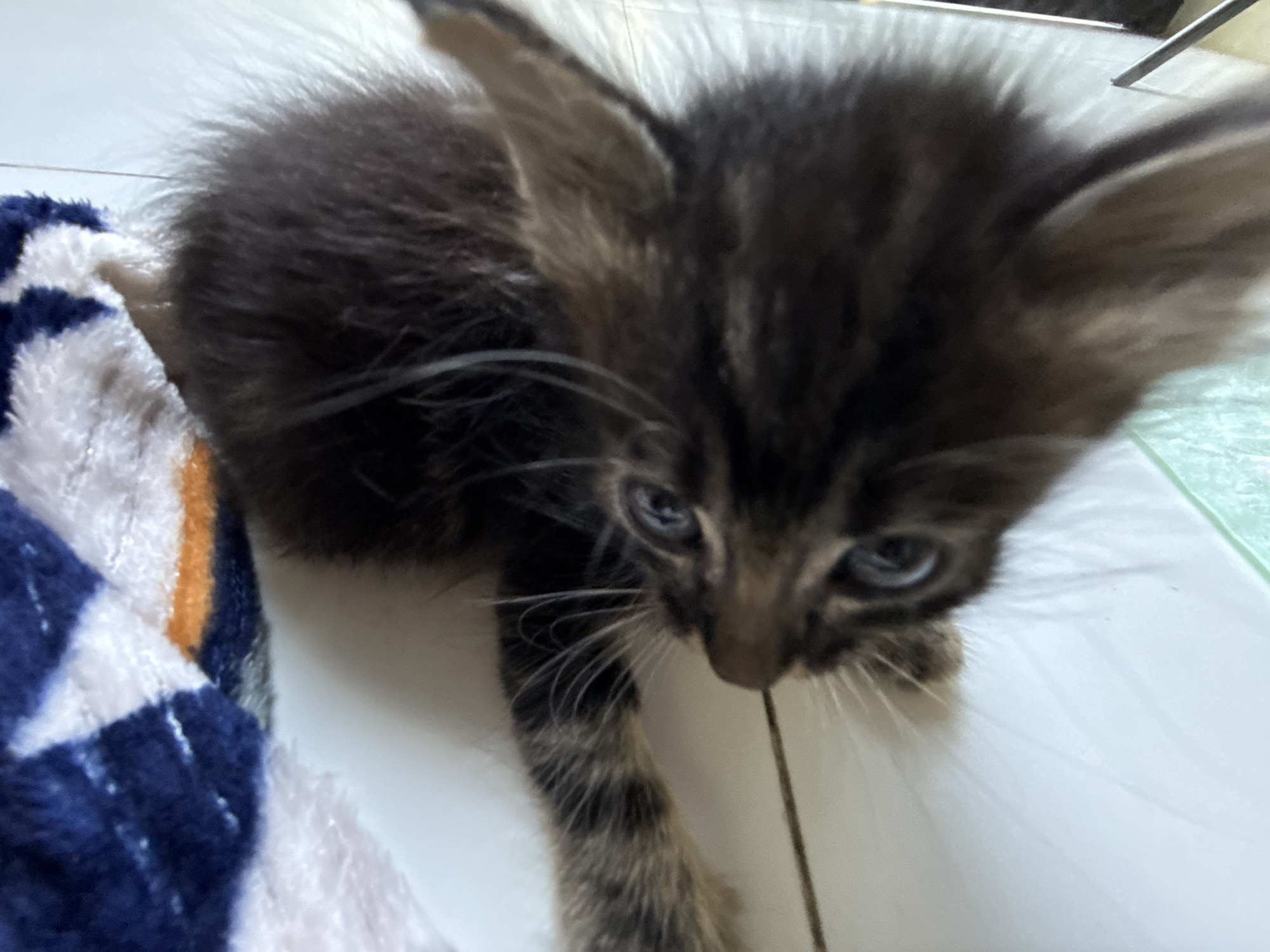 - "A close-up, high-angle shot depicts a small, dark tabby kitten with large, pointed ears and pale blue eyes" by FM-hKpnb2, licensed under CC BY 4.0
