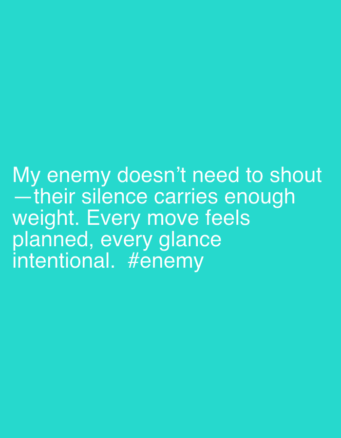 The image displays a digital graphic with a solid teal background. White, sans-serif text is centrally aligned in the lower half of the image. The text reads: "My enemy doesn't need to shout\n—their silence carries enough\nweight. Every move feels\nplanned, every glance\nintentional. #enemy". No people, subjects, objects beyond the text, actions, or physical environment are depicted. The image does not contain any visual information to indicate a specific physical location within the city of Troyan, Bulgaria, or anywhere else.