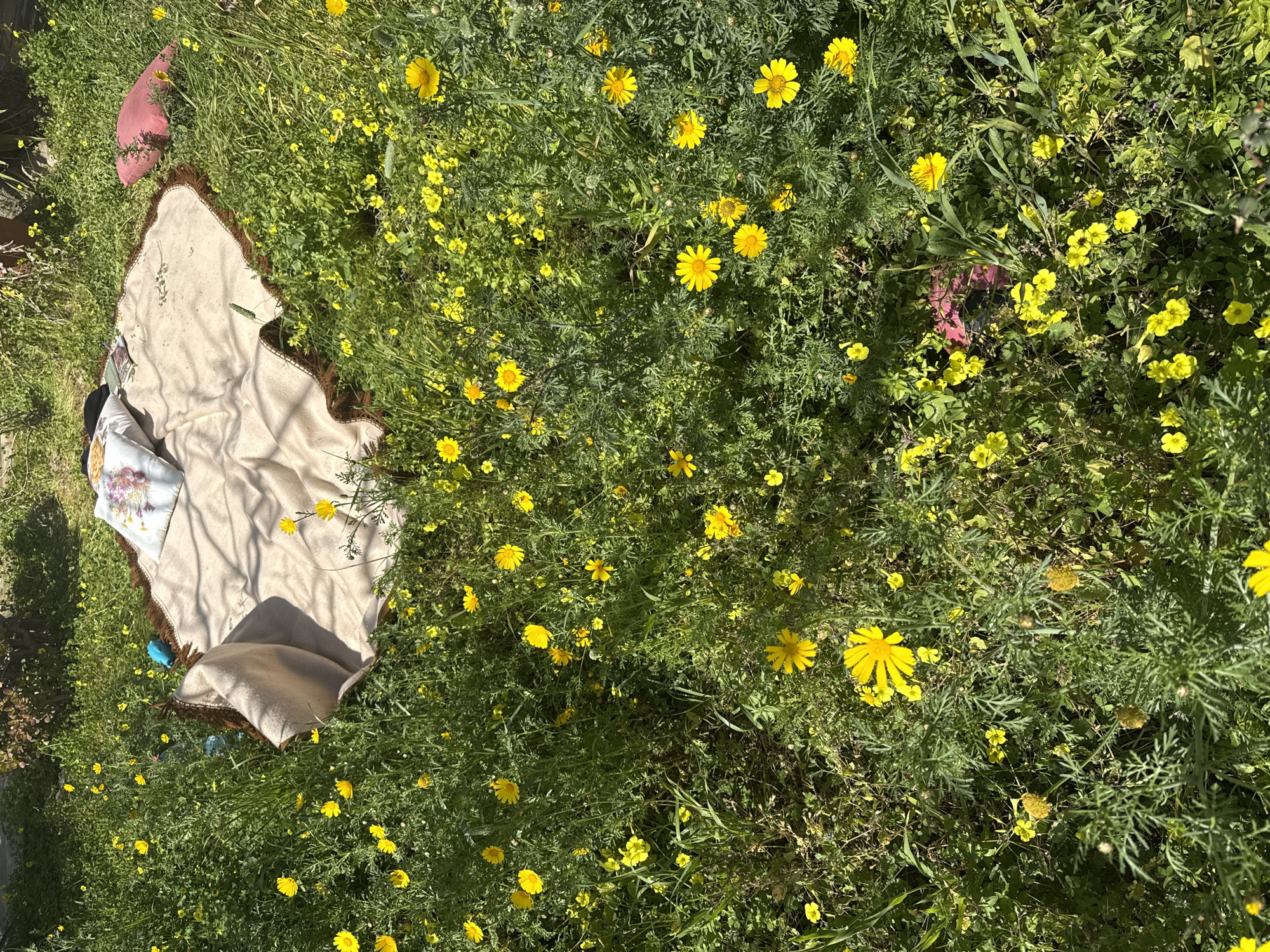 The scene depicts an unoccupied picnic setting within a grassy area characterized by abundant yellow wildflowers. The location is Aegina, Greece. In the upper central portion of the image, a light beige blanket with a dark brown, possibly fringed, edge is spread on the ground. Two pillows rest on and beside the blanket: one white with a floral pattern featuring pink, orange, and purple hues is on the blanket, and a plain pink pillow lies to the right of the blanket on the grass. A blue plastic bottle is visible near the upper left edge of the blanket. Small, indistinct objects, possibly a book or electronic device, are present on the blanket near the white pillow. The ground is covered with vivid green grass and numerous small yellow flowers, resembling daisies or oxalis, which are scattered densely throughout the frame. Shadows from an unseen overhead object are cast across portions of the blanket and grass, indicating direct sunlight. No individuals, actions, or interactions are visible.