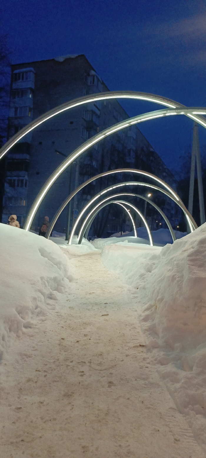 The scene depicts a pedestrian pathway in Chaikovsky, Russia, during nighttime or deep twilight in winter conditions. The pathway, viewed from a low angle, is partially cleared of snow, revealing packed snow and some dark ground, and is bordered on both sides by significant, undisturbed snowbanks. A linear series of at least five progressively smaller, curvilinear arches spans the pathway. Each arch is constructed from a light-colored, reflective material and features continuous internal illumination along its underside. In the mid-ground, to the left of the pathway and near the initial arches, two individuals are visible standing on a snowbank. One individual wears a light-colored, hooded winter coat, while the second wears a darker, possibly patterned winter coat. Their specific actions or interactions are not discernible. The background features a multi-story, dark-toned residential building with multiple windows and balconies visible on the left, displaying snow accumulation on its roofline. Another building facade is partially visible further to the right. Bare tree branches are silhouetted against the dark blue sky. Distant artificial lights are discernible further down the path beyond the archway structure. The environment is characterized by heavy snowfall and artificial illumination under a dark sky.