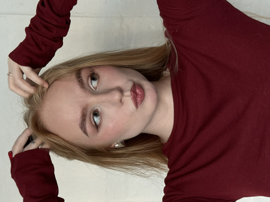 The image depicts a young adult female in an indoor setting within the city of Chaikovsky, Russia. She has long, light brown hair parted centrally, which she holds with both hands positioned on the sides of her head. Her hands are covered by the sleeves of a dark red, long-sleeved top, and her fingernails are painted red. A thin silver-colored ring is visible on the ring finger of her left hand. Her face is made up with blush, dark eyeliner, light eyeshadow, and glossy pink lipstick on slightly puckered lips. She wears silver-colored, possibly square, stud earrings in both ears. Her light-colored eyes are directed towards the viewer's right. The background consists of a plain, light-colored wall.