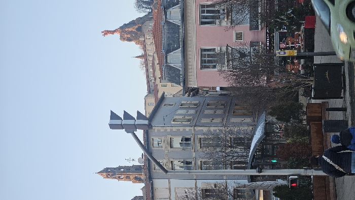 This image depicts an urban scene in Le Puy-en-Velay, France, with prominent landmarks in the background. The perspective is from a street level, looking towards higher ground. In the foreground, two pedestrians, an adult and a child, are seen from behind, walking towards the right side of the frame. The adult wears a dark jacket and a white cross-body bag strap. The child wears a blue jacket and a blue hat, holding the adult's hand. To their right, the front portion of a light green compact car, blurred by motion, travels right-to-left. A black traffic light pole is situated in the lower left, displaying a green light for vehicles and a red "standing person" symbol for pedestrians. Several large planters containing bare trees and small shrubs are arranged along the street. Some planters are rectangular and made of rusty metal, while others are dark square pots. The midground features a street lined with multi-story buildings and street furniture. On the left, a light gray building with white stone quoins and window trim has several windows, some with closed light-colored shutters and others with small balconies. To its right, a prominent traffic light structure, comprising three horizontal gray triangular sections, extends diagonally upward from a pole. Further right, a pink building with elaborate white decorative molding and a dark gray mansard roof with dormer windows is visible. Its ground floor contains commercial establishments, including one with "IMM.K.C." on its signage. In front of this building, large, illuminated gingerbread man figures serve as holiday decorations. Between the buildings, a modern-looking structure with a dark, sloped roof, possibly a kiosk or shelter, is surrounded by greenery. The background is dominated by two key landmarks of Le Puy-en-Velay under a clear, pale blue sky. On the left, the dark brown, Romanesque bell tower of the Cathédrale Notre-Dame du Puy stands tall. On the right, the reddish Statue of Notre Dame de France, depicting the Virgin Mary holding the Christ Child, is perched atop the jagged volcanic rock formation known as Rocher Corneille. Additional buildings and bare trees are visible on the hillside surrounding the rock.