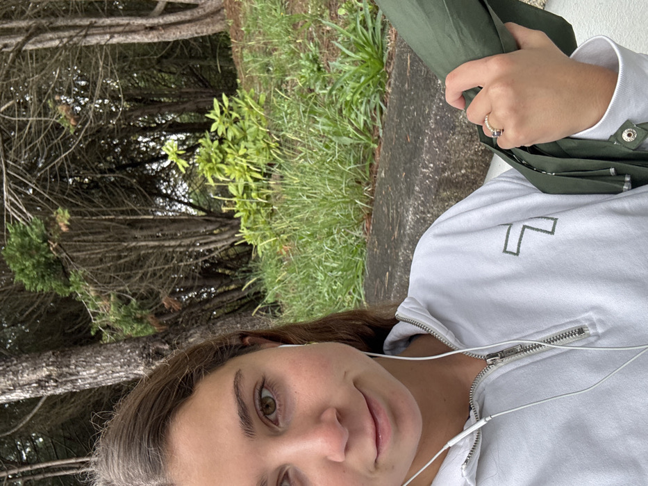 The image captures a young female outdoors in Aldoar, Foz do Douro e Nevogilde, Portugal. She is positioned in the foreground, facing slightly right but looking directly at the camera. She has light brown hair, brown eyes, and is wearing a light grey or white hooded sweatshirt with a partially unzipped collar and a dark green embroidered numeral "7" on the right chest. White wired earbuds are visible in both ears, with the wire extending downwards. Her left hand is visible, holding a folded dark green umbrella. A ring with a central dark stone surrounded by smaller clear stones is on her left ring finger. The background consists of dense, predominantly coniferous trees with dark trunks and sparse foliage, indicative of a forested or heavily vegetated area. In the mid-ground, a low stone or concrete barrier runs horizontally, separating the foreground from an area of tall green grass and a small cluster of brighter green leafy plants. The scene is illuminated by natural light, possibly on an overcast day.