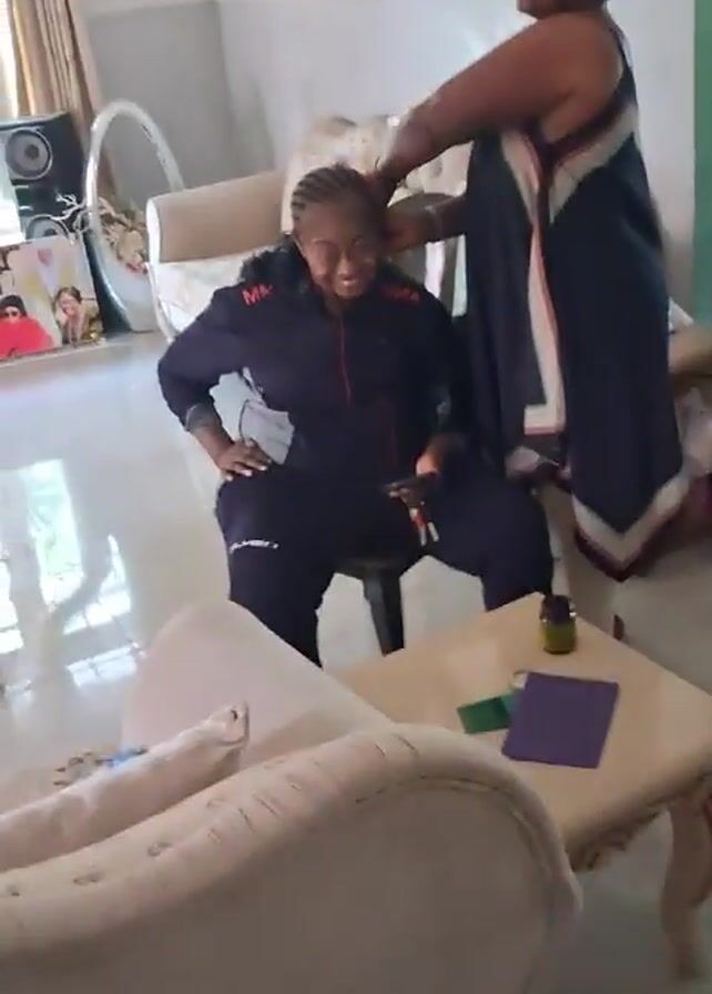 In a well-lit room, two women are present. One is seated, wearing a dark blue tracksuit with the word "MMA" displayed. She holds a smartphone and smiles toward the camera. The other woman, standing, wears a dark dress with a patterned shawl. She is styling the seated woman's hair, braiding it. A white sofa with gold trim sits in the foreground. A white table with a green notepad and a small brown jar is nearby. In the background, a mirror and other furniture are visible.