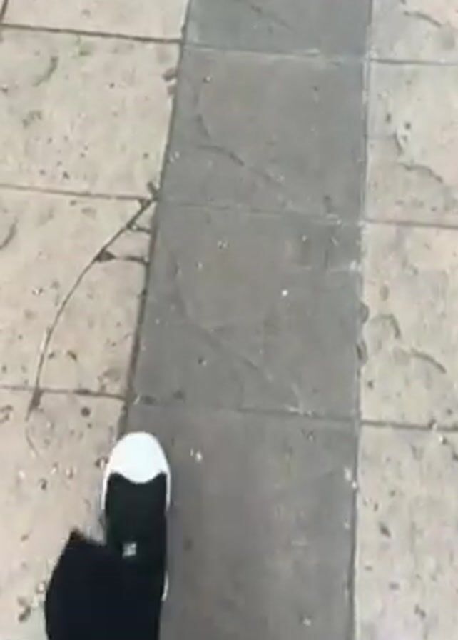 street scene, likely in a city. The ground is paved with light and dark gray tiles. The camera starts by showing the feet of someone wearing black pants and white sneakers. The camera then pans up to reveal a street vendor's setup. The vendor has laid out several mats on the sidewalk, displaying various items for sale, including pillows, backpacks, and clothing. A sign on the sidewalk reads "ALMOHADAS 2X$5" indicating the pillows are on sale. Pedestrians can be seen walking on the sidewalk and crossing the street in the background. The street is lined with buildings and trees, and there is a traffic light visible.