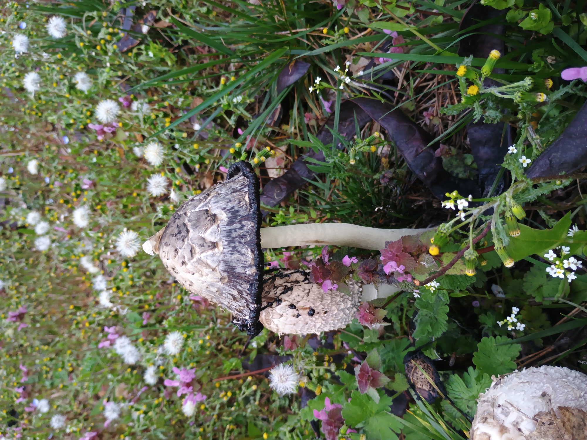 - "close-up of a partially decomposed mushroom, possibly a shaggy ink cap (Coprinus comatus), lying on its side amongst various low-growing plants" by FM-LHAN62, licensed under CC BY 4.0