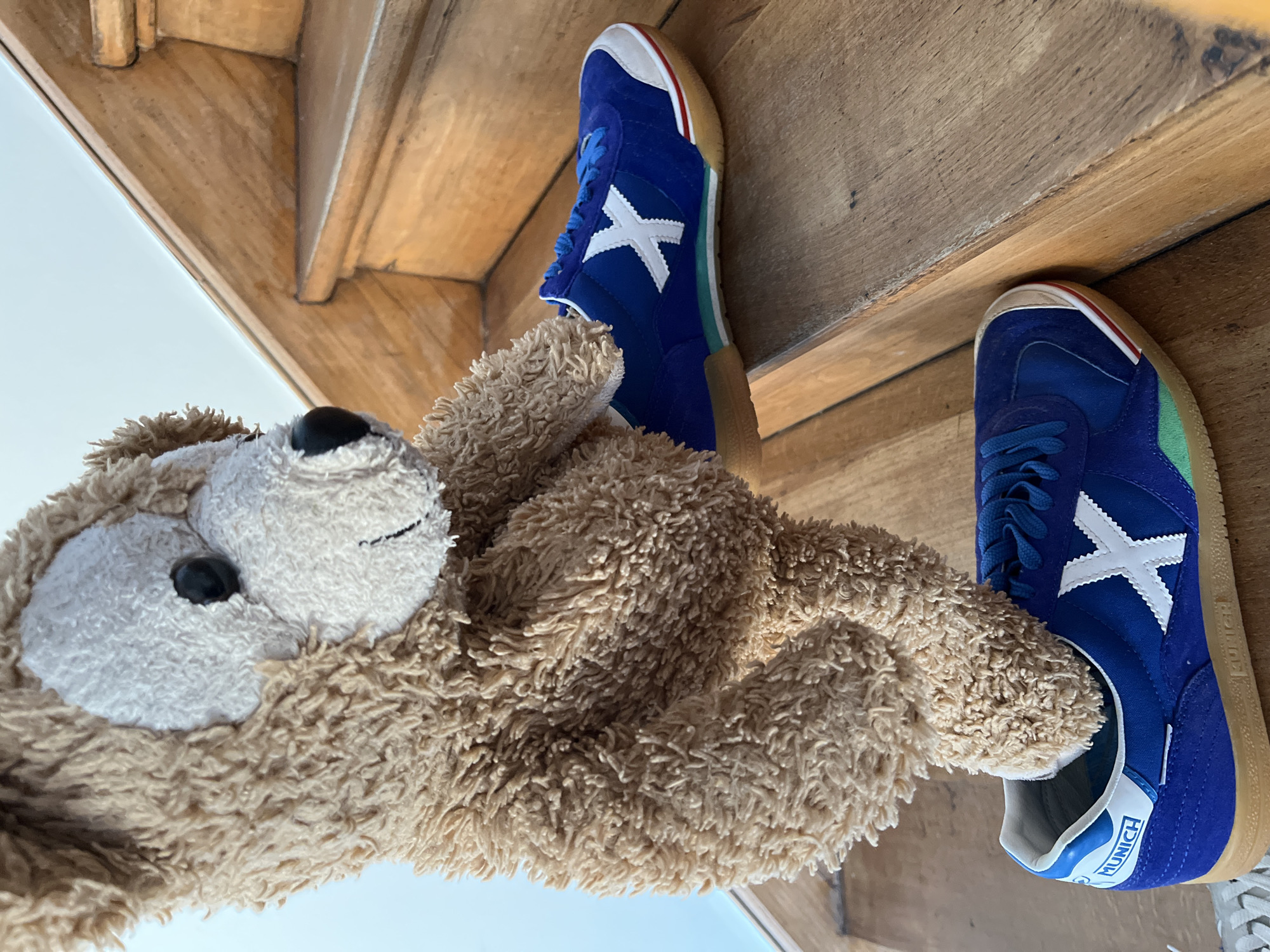 An indoor scene in Foetz, Luxembourg, depicts a light brown, shaggy-textured plush toy, resembling a bear, positioned as if ascending a wooden staircase. The plush toy, featuring a lighter muzzle and black button eyes, has its lower appendages inserted into two blue Munich brand athletic shoes. The shoes are characterized by blue suede-like uppers, blue laces, white toecaps, a prominent white 'X' logo on the side, and a multi-banded sole detailing in red, white, and green above a light brown gum sole. One shoe rests on a lower wooden stair tread, while the other is placed on the tread immediately above it. The staircase exhibits natural wood grain and signs of use. A light-toned wall or open space forms the background above the stairs.