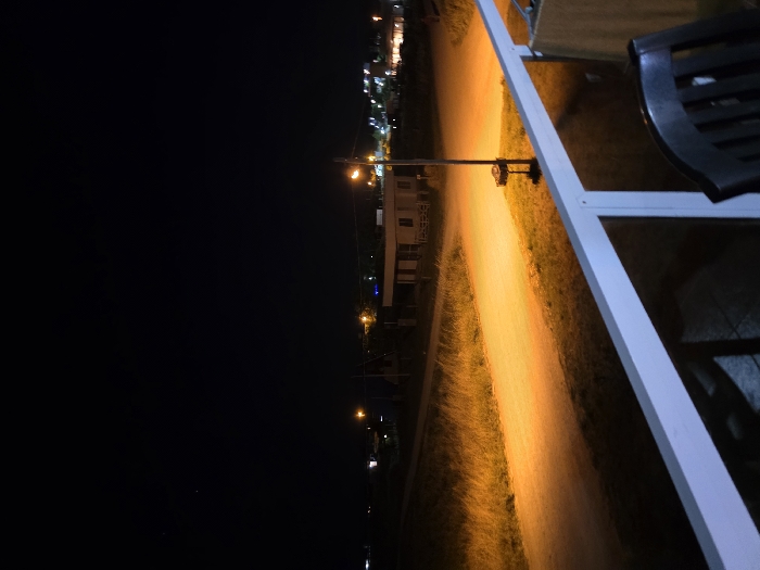 A long, illuminated path stretches into the distance, lined with grass. Streetlights dot the scene, casting a warm glow. A dark night sky fills the left side of the frame. A structure with white framing is visible on the right, with a dark object, possibly a chair, partially visible within it. Other structures with lights are observed far into the background.