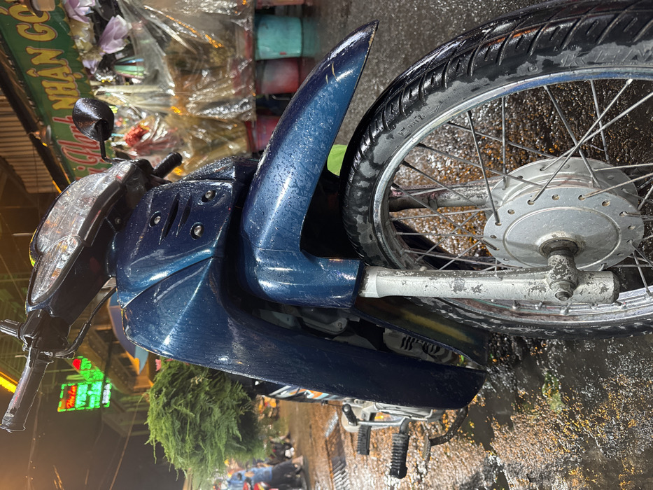 The scene depicts an urban street at night in Thủ Đức, Vietnam, under wet conditions consistent with recent or ongoing precipitation. A dark blue underbone motorcycle, a Honda Wave-style model, is parked in the foreground, oriented slightly to the left. Its exterior surfaces, including the front fender, headlight assembly, and handlebars, are visibly covered in numerous water droplets. The front wheel features silver spokes and a silver hub; its tire displays a wet tread pattern. The front suspension forks exhibit areas of paint wear and minor corrosion. A substantial, dense bundle of green evergreen foliage is secured to the rear of the motorcycle, extending behind the seat. In the middle ground to the right, a market stall is present, displaying multiple items, possibly flowers or ceremonial goods, individually wrapped in clear plastic and arranged in buckets. A green awning with yellow Vietnamese text, partially readable as "Lễ Hạnh Nhân Gió," extends over this stall. To the left, a blurred background reveals several indistinct human figures, some appearing to wear face masks, and a bright neon green sign with Vietnamese text, "Hoa Lan." The ground, consisting of wet asphalt or concrete, reflects ambient artificial lighting.