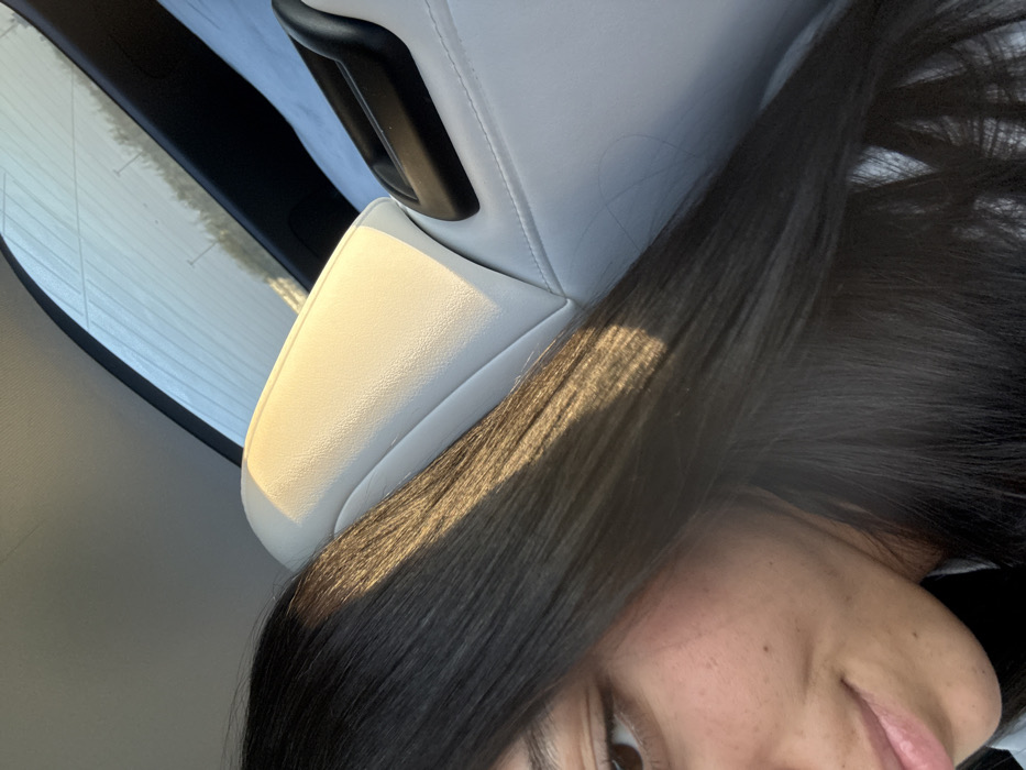The image depicts a partial view of a female subject seated within a vehicle, located in Tira, Israel. The lower-left quadrant of the frame shows the subject's left eye, cheek, and a portion of her mouth, characterized by olive-toned skin and visible freckles. Her hair is dark, long, and straight, extending diagonally across the frame. Direct sunlight illuminates sections of her hair and the visible skin. The vehicle's interior features a prominent white upholstered seat or headrest, visible on the right side of the image, which is also strongly illuminated by sunlight. Through the rear window of the vehicle, a light blue sky and a blurred outdoor environment with horizontal defroster lines are discernible. A black grab handle is integrated into the white interior panel on the far right. No specific action or interaction is discernible beyond the subject being seated.