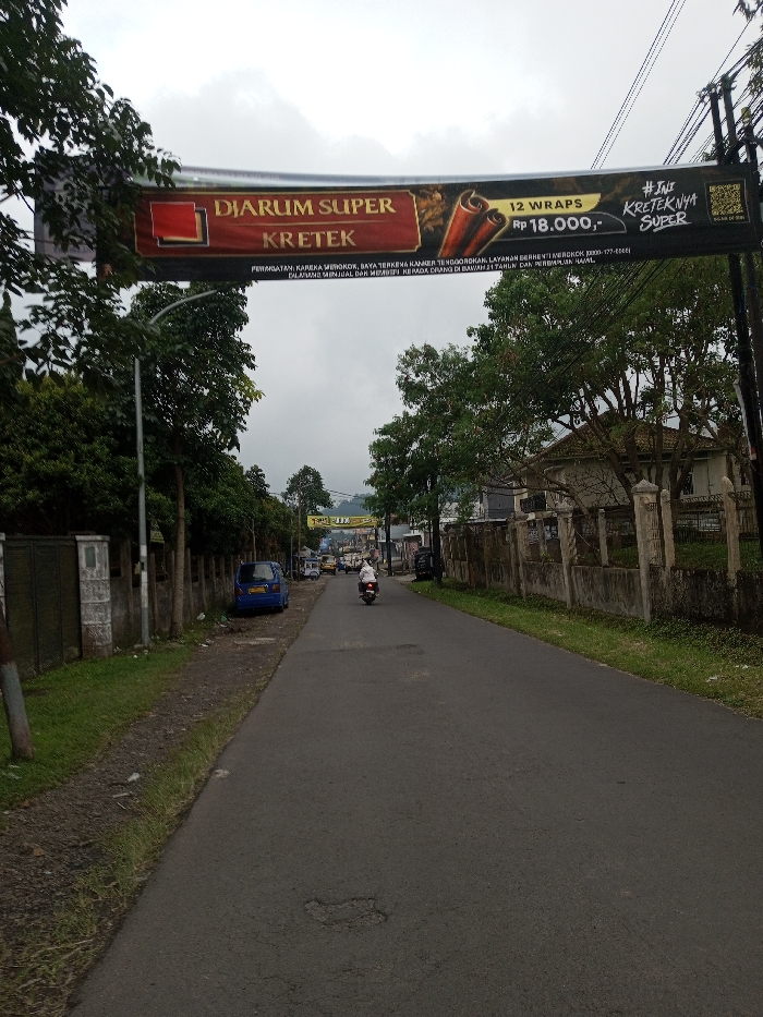 The scene depicts a street view within the city of Sandamal Eliya, Sri Lanka, under an overcast sky. A wide, dark grey asphalt road extends from the foreground into the distance, showing some surface imperfections. An overhead banner spans the width of the road, displaying "DIARUM SUPER KRETEK," "12 WRAPS RP 18.000,-," and Indonesian text for a warning about smoking, a quitline number, and age/pregnancy restrictions. Two rolled kretek cigarettes are pictured on the banner, which also features a QR code and the hashtag "#INI KRETEKNYA SUPER." On the left side of the road, a dirt shoulder and a narrow strip of green grass run alongside a concrete fence partially obscured by dense green foliage and trees. A blue mini-van is parked further down this side. A street light pole is visible on the left. On the right side, a similar concrete fence with posts separates the road from a property featuring a multi-story, light-colored building (house) and more trees. A lone individual, dressed in light-colored attire, is observed riding a white scooter away from the viewer in the middle of the road. Further down the street, a cluster of various vehicles, including cars and vans, are visible, some appearing to be parked, others in motion. Another yellow banner or sign is discernible in the far midground, also spanning the road. Distant hills or mountains are faintly visible through the hazy background, mostly obscured by the cloudy sky and vegetation.