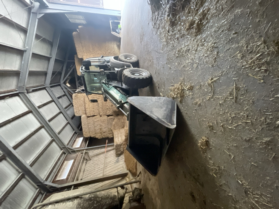 The image depicts the interior of a large agricultural building or barn located in Bleiburg, Austria