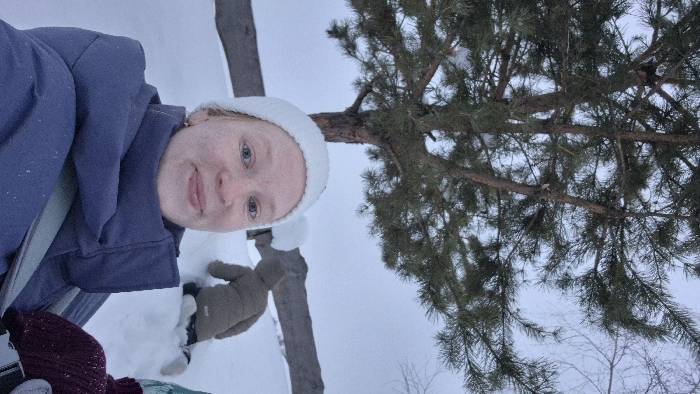 The image displays a snowy outdoor scene in Nizhnyaya Gar', Russia. In the immediate foreground, a fair-skinned individual with light eyes and a slight smile wears a white knitted beanie with a pom-pom and a dark blue puffer jacket, holding a camera to capture a selfie. Small white particles, consistent with snowflakes, are visible on the jacket. Behind and to the left of the foreground subject, a large conifer tree with green needles and visible brown bark is heavily laden with snow on its branches. In the mid-ground, a child wearing a light brown hooded snowsuit kneels on their hands and knees in the deep snow, facing away from the camera. To the far right, a partial view of a burgundy knitted hat indicates the presence of a third individual. An elongated, dark object, possibly a log or fence, is partially obscured by snow and stretches horizontally across the background. The sky is uniformly white-gray, and all visible ground surfaces are covered with a thick layer of white snow.