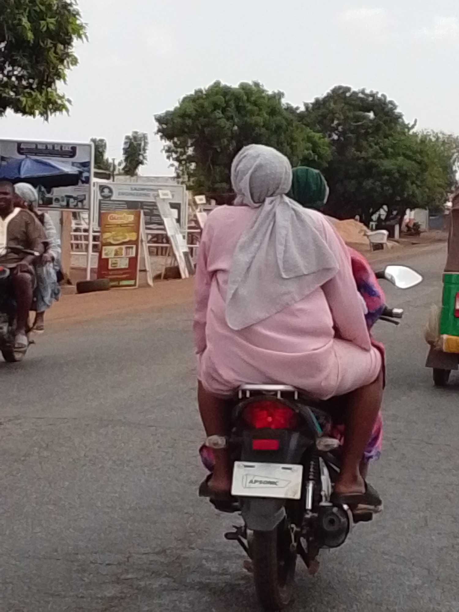 A medium, outdoor shot shows two women riding on a black moped down a paved street in Tamale, Ghana, with a light-gray sky above. The first woman, in pink clothing and a light-gray headscarf, is in the back. The second woman has a green head covering and is wearing pink clothing. Both women are dark-skinned and wearing sandals or slippers. The moped has a rectangular license plate with the word "APSONIC" visible. To the left is another moped with two people of color wearing head coverings. In the background are some trees and several white-framed signs or displays that appear to be for a business establishment. There is a 3-wheel vehicle in the right background. The street is paved and gray.