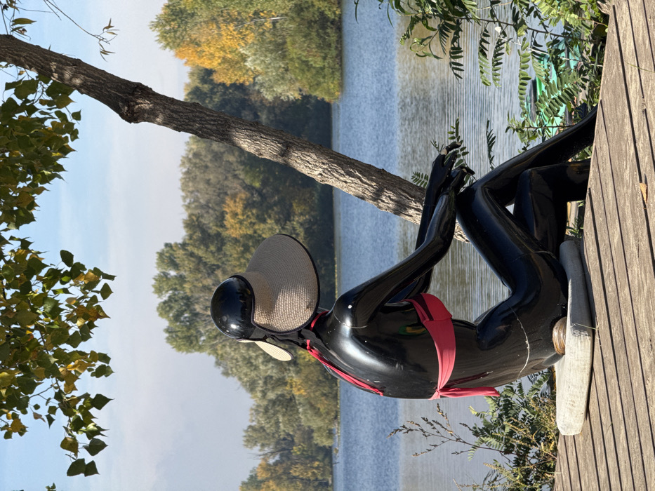 A glossy black mannequin is depicted in a seated posture on a wooden deck, facing away from the camera and looking towards a body of water. The mannequin wears a red bikini top, tied in the back, and a light beige straw sun visor with a black trim, which rests on its smooth, dark, spherical head. It sits on a rectangular, ribbed light grey cushion. A tree trunk ascends vertically from the wooden deck on the right, with branches bearing green and yellowing leaves extending into the upper left quadrant of the frame. The midground features a calm expanse of blue water, indicative of a lake or river channel, consistent with the environment around the Dnieper River in Dnipro, Ukraine. The distant shoreline is densely forested with trees exhibiting autumnal foliage in shades of green, yellow, and orange, under a clear blue sky. Partially visible on the water near the far bank are green and light blue recreational boats, possibly kayaks or paddle boats. The wooden deck in the foreground includes sporadic green foliage and a single fallen autumn leaf.