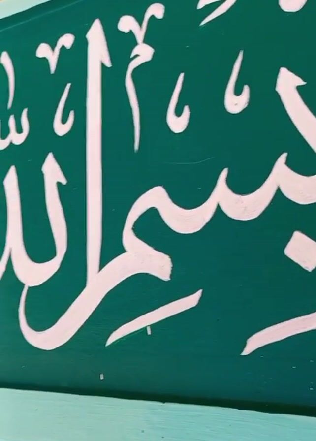 close-up of a painted Arabic calligraphy on a rectangular green background