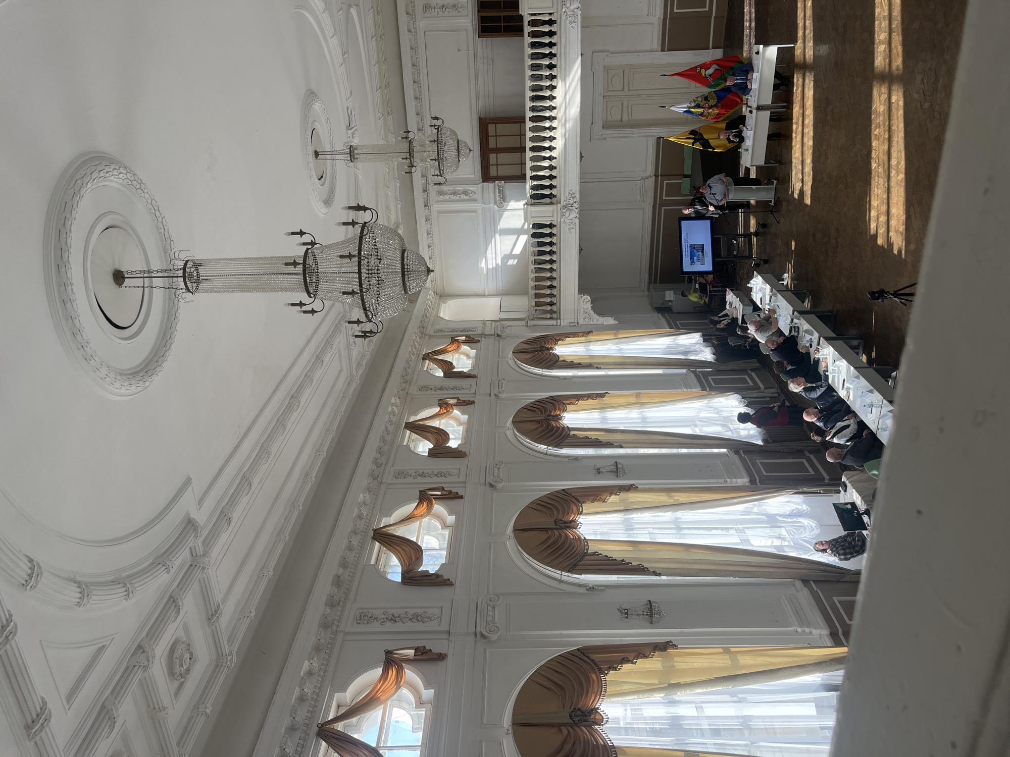 The image displays a formal gathering within a grand hall in Ново-Никольское, Russia