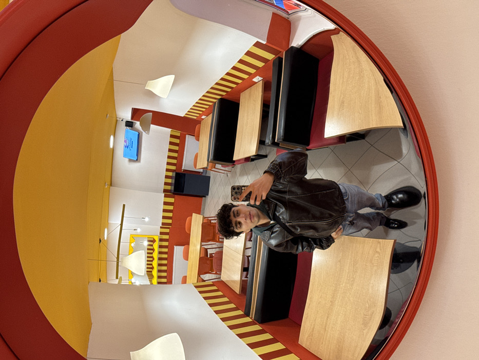 - "The image depicts a young male individual taking a selfie in a large, convex, red-framed security mirror inside a casual dining or fast-food style restaurant in Tbilisi, Georgia" by FM-CyJrW2, licensed under CC BY 4.0