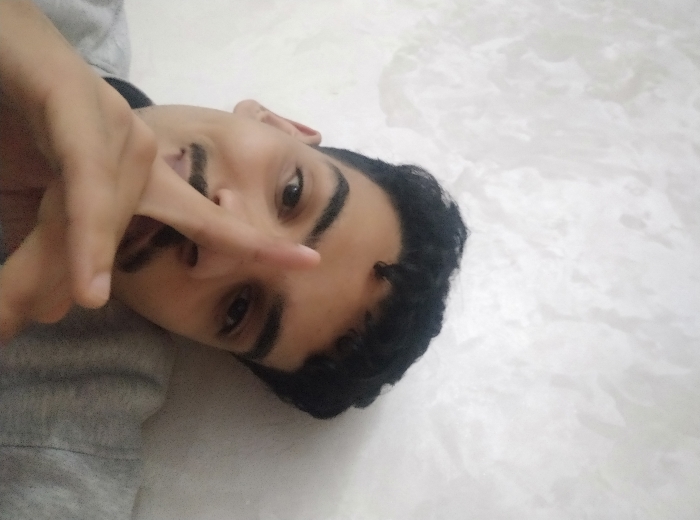 A young man poses close to the camera. He has dark curly hair, dark eyebrows, and a mustache. He is wearing a gray sweatshirt. He is making a gesture with his hand, pointing two fingers towards his face. The background appears to be a light-colored, possibly white, surface with subtle variations. The image is taken at an unusual angle.