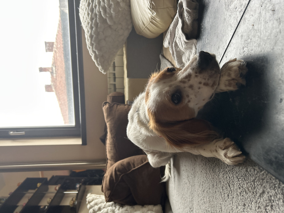 - "A medium-sized dog, predominantly white with orange-brown patches and spots on its head and legs, lies prone on a dark floor, its front paws tucked" by FM-MRhzP2, licensed under CC BY 4.0