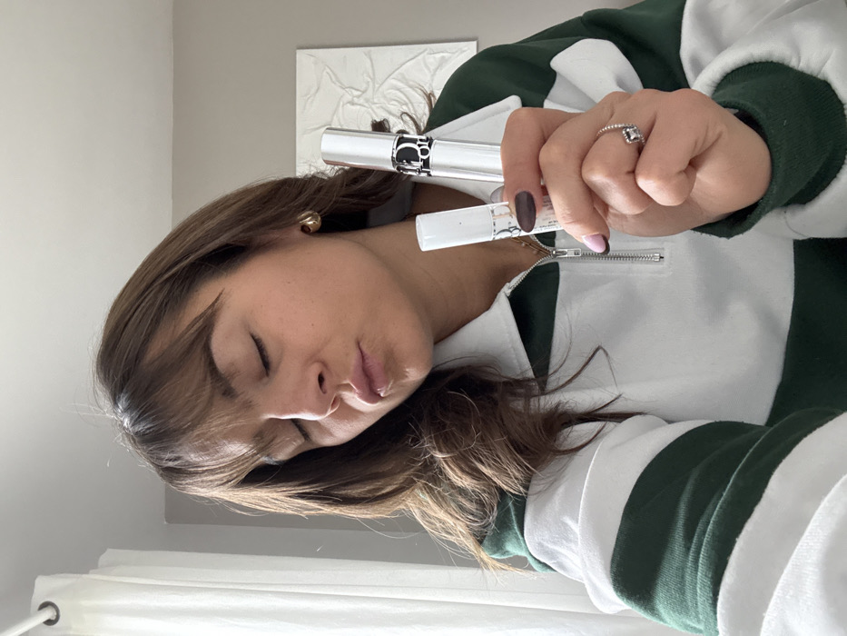 In an indoor setting located in Veauchette, France, a young adult female is depicted from the chest up, with her eyes closed and lips pursed. She has medium-length brown hair with bangs and is wearing a green and white quarter-zip sweatshirt with a collar. A gold-colored hoop earring is visible on her right ear. Her right hand, with light pink and dark nail polish, holds two white, cylindrical cosmetic products. The larger product, positioned behind the smaller one, clearly displays a prominent "DIOR" logo in black lettering. A silver-toned ring with a dark square stone is present on her right ring finger. The background consists of a plain light beige wall, with a white textured art piece visible on the right. To the left, white curtains with a metal grommet are partially visible.
