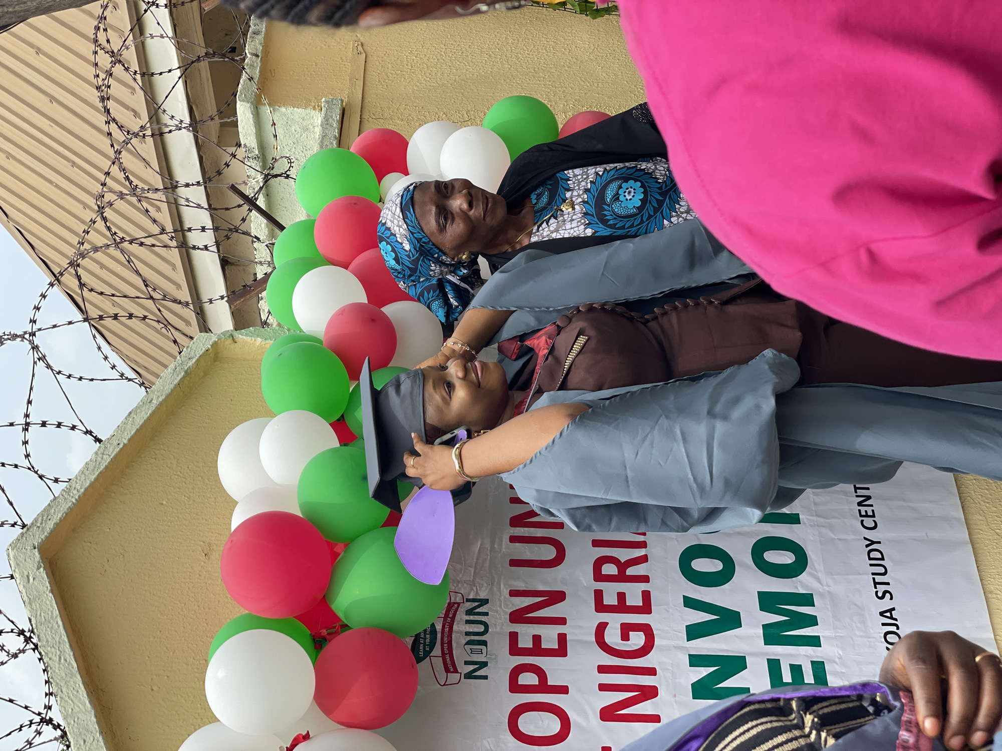 woman adjusting the mortarboard of a younger woman dressed in a graduation gown. They are posed in front of a backdrop banner that reads "OPEN UN NIGERIA NVO EMO OJA STUDY CENT". There are red, white, and green balloons to the left of the women. A building's exterior and coiled barbed wire are visible above the balloons. The backdrop includes an abbreviation of the National Open University of Nigeria in Lokoja, Nigeria.