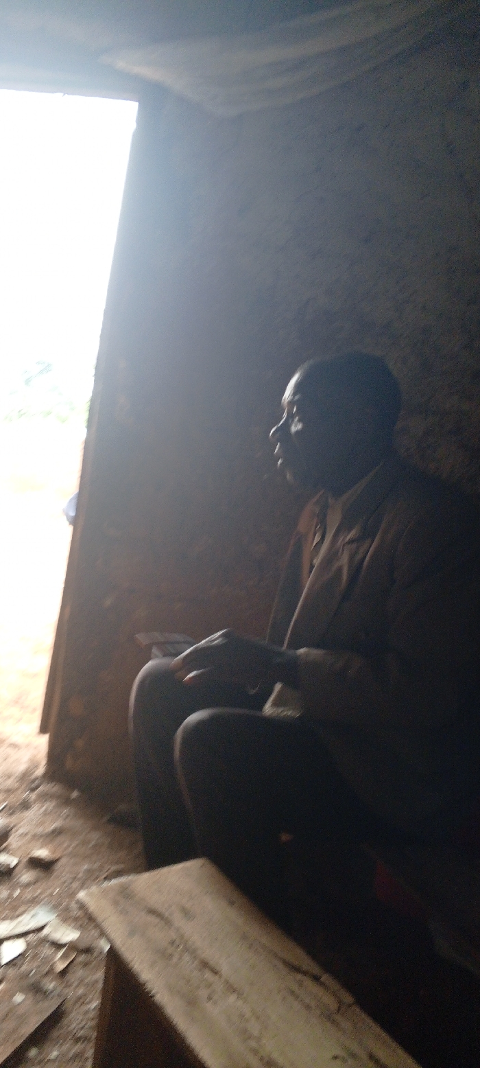 The image depicts a dimly lit interior scene in Abengwa, Democratic Republic of the Congo. A single adult male individual, with dark skin, is seated facing towards a bright rectangular opening on the left side of the frame. He is wearing a light brown or tan jacket over a lighter shirt. His hands are clasped or resting on his lap. Partially visible on his lap is a stack of rectangular objects, possibly papers or currency. The interior walls appear to be of an earthen or natural material, and the floor in the foreground shows loose debris. The opening reveals bright outdoor light and a glimpse of green foliage. A wooden plank or bench is positioned in the lower right foreground. The lighting is strong from the left opening, silhouetting much of the room and the individual.