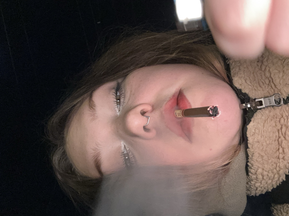A close-up, low-angle image captures an individual, presumably female, with brown hair and light-colored eyes accented by white eyeliner on the lower lash line. A silver-colored, horseshoe-style septum piercing is visible in the nose. A dark-brown, cylindrical cigarillo or joint is held between the subject's lips, its tip actively burning with a red glow and visible ash. A plume of smoke emanates to the left of the face. In the bottom right, a lighter is partially visible, held by an unseen hand. The subject wears a light-brown, textured jacket with a visible metal zipper. The background is uniformly dark, providing no discernible environmental features. The specific location within the city of Engels, Russia, cannot be determined from the visual information present in the image.