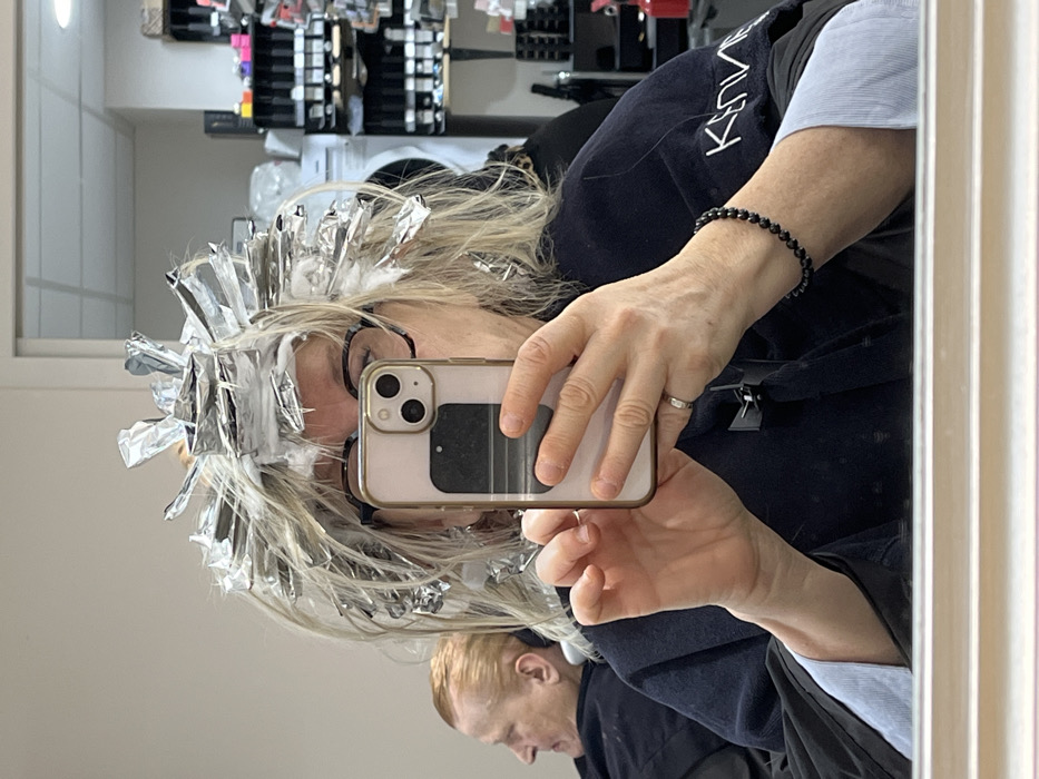 A woman is depicted taking a mirror selfie inside a hair salon located in Montrond-les-Bains, France. The primary subject, a fair-skinned individual with light-colored hair, is positioned centrally, her head adorned with numerous foil packets indicative of hair highlighting treatment. She wears black-rimmed glasses and a dark salon cape, bearing the white text "KENRA" on the right shoulder, over a light blue long-sleeved shirt. Her right hand, featuring a black beaded bracelet, holds a light-colored smartphone with a dual-camera system, which obscures part of her face. A silver-colored ring is visible on the ring finger of her left hand. To the left in the mirror's reflection, a second individual, appearing to be an older woman with short, light-brown hair, is visible from the side, seated in a salon chair and wearing a dark cape, facing away from the camera. The background reveals white walls, a white ceiling with visible light fixtures, and various salon elements including shelving stocked with hair products in bottles and containers, and a partially visible white utility appliance. The bottom edge of the mirror is visible in the foreground.