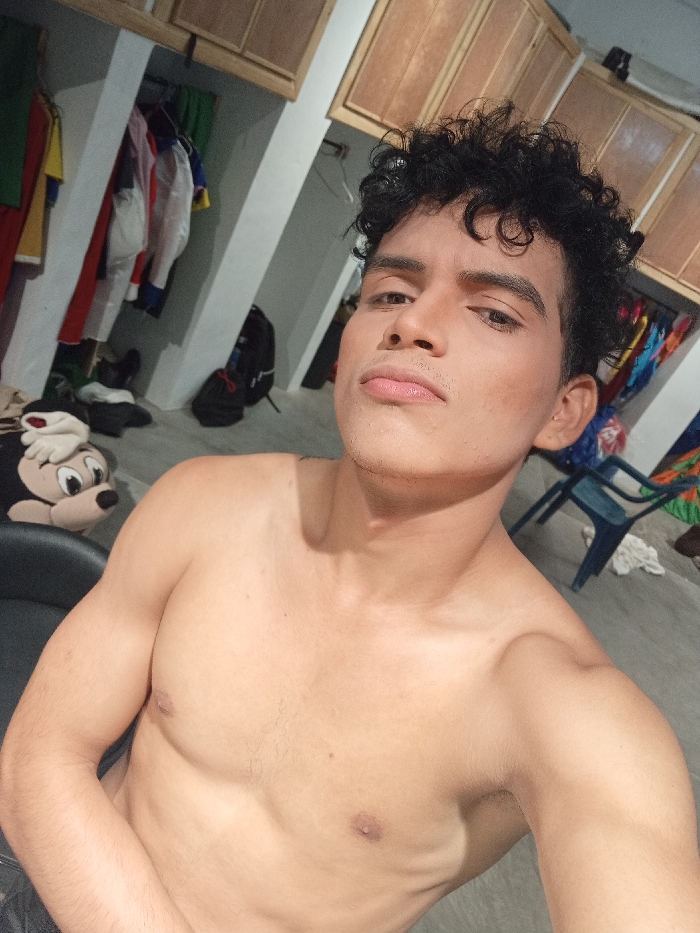 A shirtless young man with curly black hair takes a selfie. His skin tone is medium, and he appears to be in his late teens or early twenties. Background details include a Mickey Mouse plush toy, hanging clothes, a backpack, a plastic chair, and wooden cabinets. The setting looks like a bedroom. The overall lighting is bright.