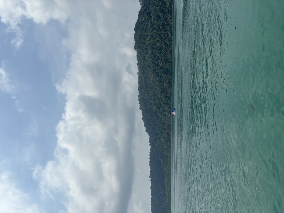 A serene horizontal view of a lush, tree-covered island coastline meets tranquil, aqua-colored water. Patches of clear blue sky peek through a sky filled with scattered clouds. In the distance, a small boat floats on the water. A single, dark log rests near the surface of the water. The composition is evenly divided between the sky, island, and water, creating a sense of balance.