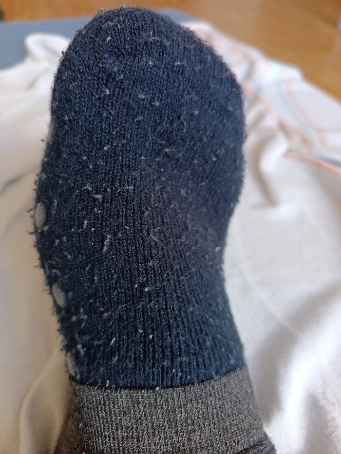 - "A close-up, high-angle shot depicts a left foot encased in a dark blue sock, heavily affected by pilling, with numerous small, light-colored fibers adhering to its surface" by FM-rFWs12, licensed under CC BY 4.0